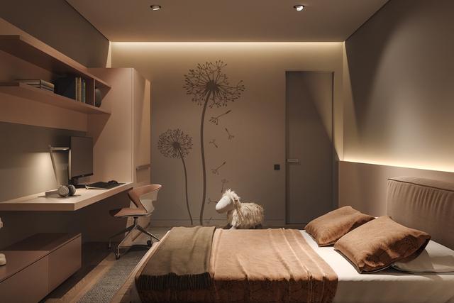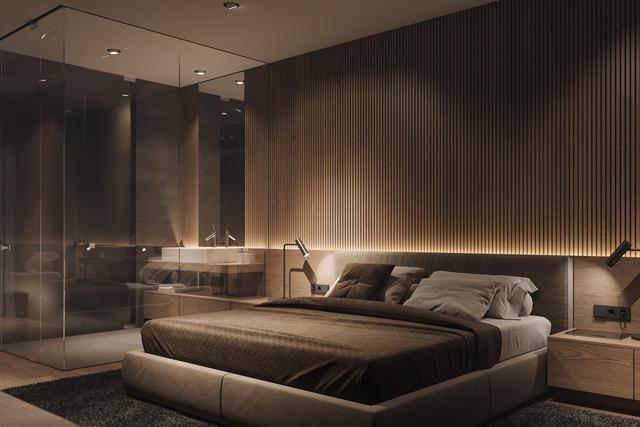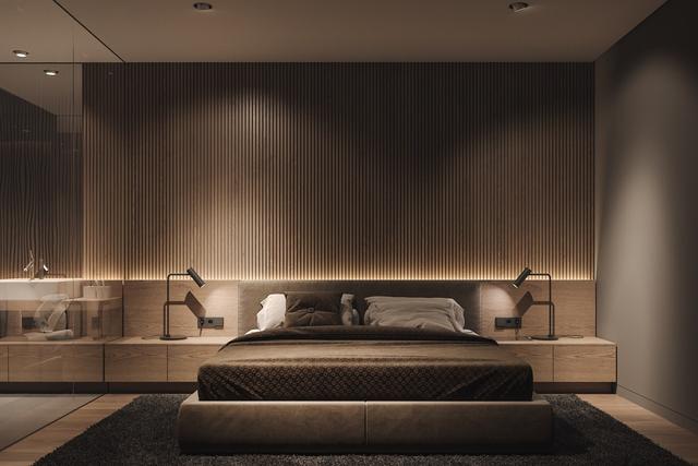 隱藏的LED條和整齊的床頭臺燈給主臥室的照明方案帶來了柔和而朦朧的氛圍。