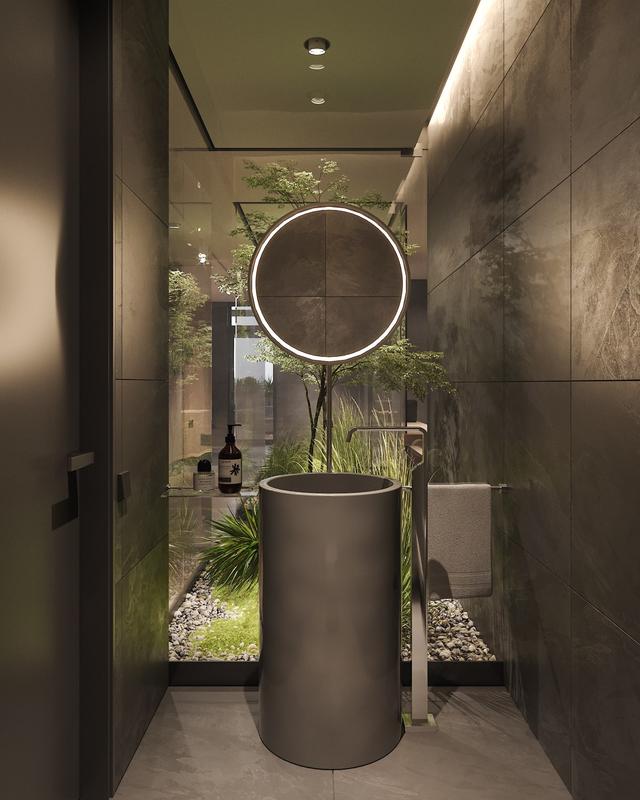 由于在玻璃隔斷中使用了智能玻璃技術,活的綠色植物也可以通過浴室的墻壁看到。其中一個這樣的隔斷在一個獨特的浴室水槽上方支撐著一面發光的梳妝鏡,盡管浴室位于內部位置,但盆的使用者仍能看到美麗的花園景色。