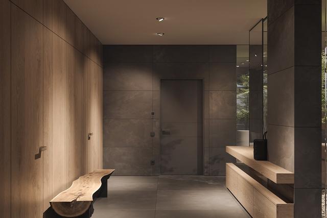 灰色瓷磚和木鑲板相輔相成,形成大膽而穩固的外觀。
