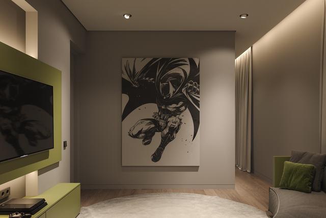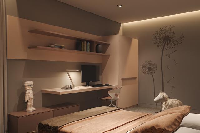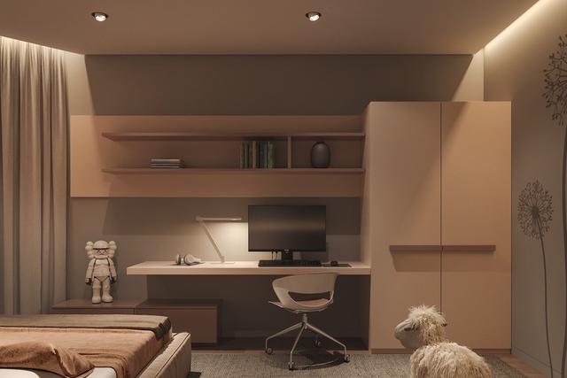 孩子們在房間里的學習區域也被裝飾成綠色,有一個綠色的書桌和毗鄰的電視墻。綠色的散置靠墊也活躍了一個彎曲的灰色沙發。