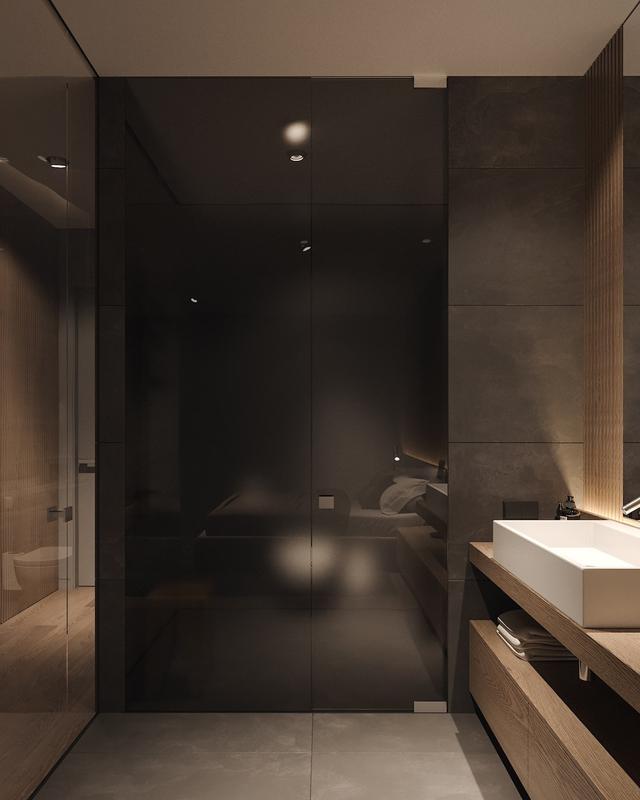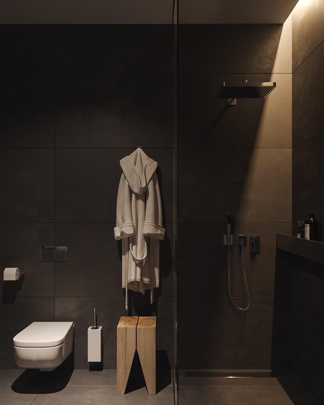 套房浴室的裝飾是黑暗和憂郁的,主要的黑色瓷磚和木材強調件。