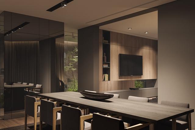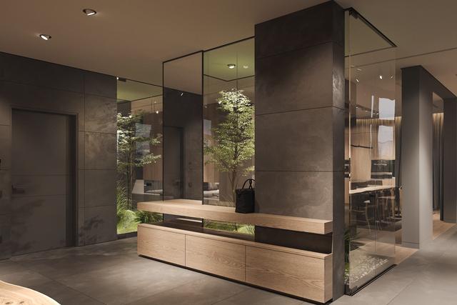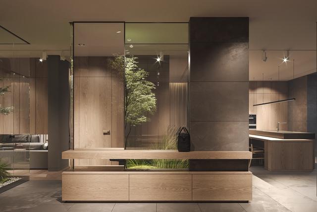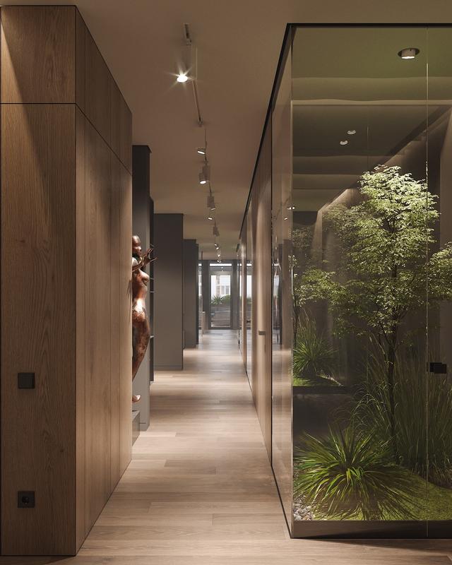 自然材料與玻璃中庭結合在一起,使公寓的內部看起來精致而簡單。
