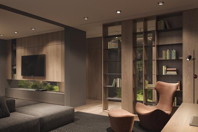 舒適的現代客廳被定向射燈和嵌壁式led燈柔和地照亮,led燈位于毛絨窗簾上方。休息區設置在炭灰色的地毯上,第二個地毯定義了一個家庭辦公空間。