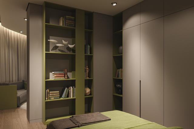 綠色書架與床罩的色調完美匹配。淺灰色的櫥柜平衡了清新的色調,提供了剩余的存儲空間。