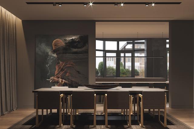 八把現代餐椅沿著長方形餐桌的每一面排成一行?,F代藝術的一個大例子就是給樸素的灰色墻壁增添個性。