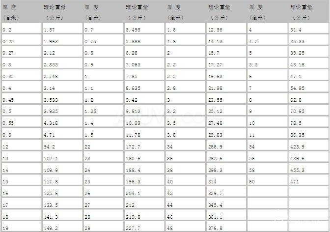 不銹鋼管理論重量表: