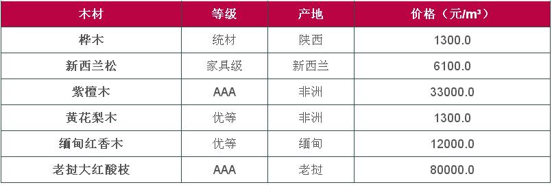 前面提到木材,都是我們現在市場上較為常見的高級實木家具所使用的木材。隨著經濟的不斷發展,人們的生活越來越好了,隨這生活中所使用的日常用具的需求也是越拉越大了,但很多的名貴木材,隨著人們的需求增大,數量也是越來越少,這些木材價格也是隨著其數量的減少日益上漲。這最后,小編也為大家帶來了這今年11月最新的木材價格表(注:表中數據均來自中國木材網)。我們一起來看一下吧。