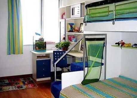 海軍風格兒童房簡單實用,童房是個孕育孩子夢想的地方,當然要裝扮得清新而夢幻,藍色的海軍風格正好是個給孩子夢想護航的好選擇。為了節省空間,兒童房里安置了一張上下兒童床,以及在靠窗的轉角位置放了一張書桌臺,色彩則以藍色和綠色為主,營造出自然而清爽的海軍風情。孩子多半是淘氣而活潑的,喜歡爬上爬下,亂蹦亂跳,由于臥室采用的是上下床,難免會給孩子造成一定的安全隱患。在上下床之間的小階梯上鋪上防滑腳墊,為孩子提供了最貼心的保護。
