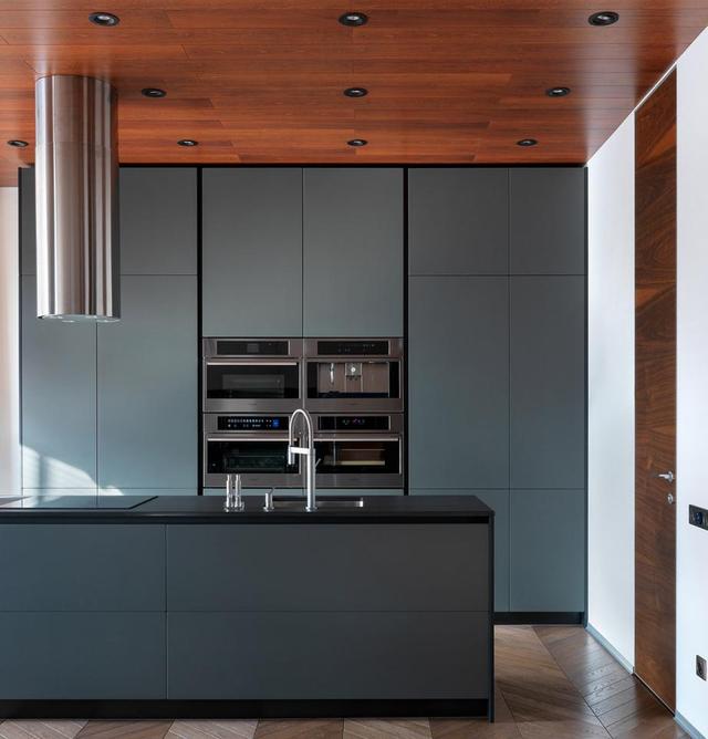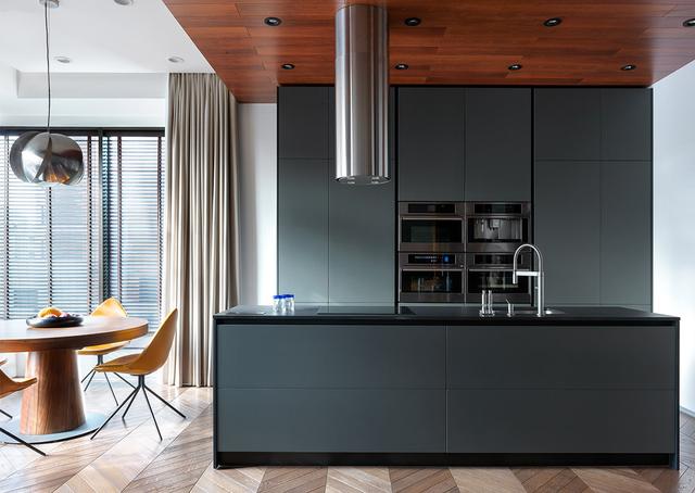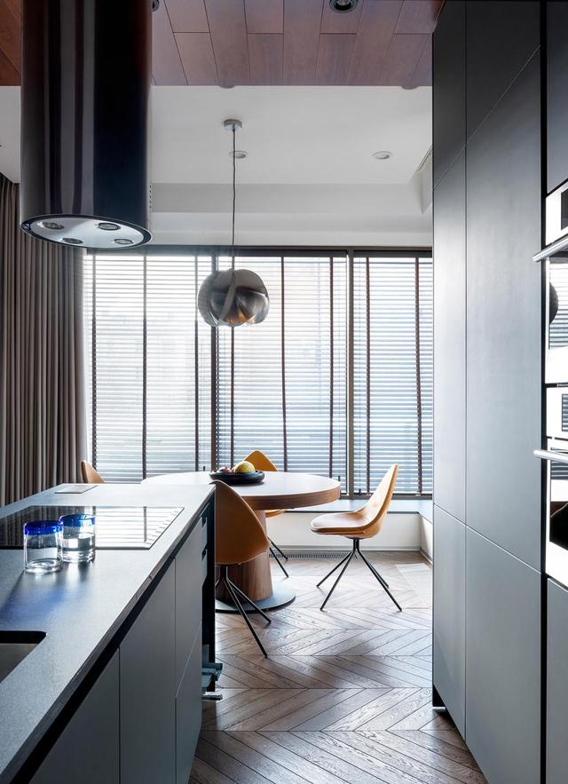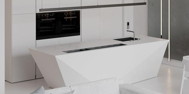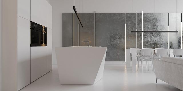 黑色的條形燈光照亮了幾何切割的廚房桌臺。