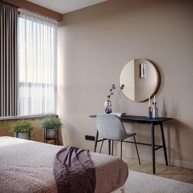 木梳妝鏡照在床頭對面的米色墻上,上方是一張漂亮的黑色梳妝臺。