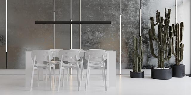 黑色直線懸掛燈點亮白色現代餐廳套裝。