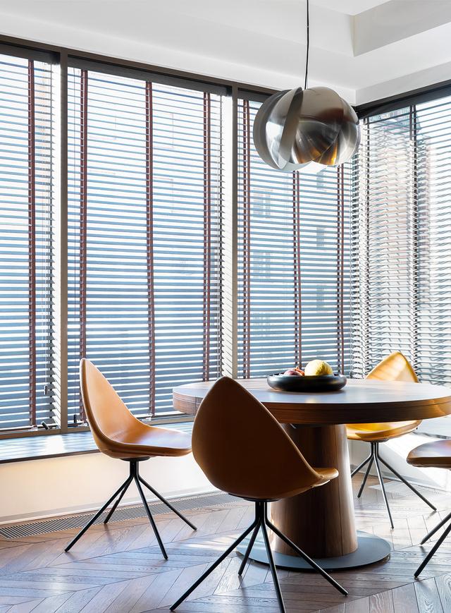 餐桌上的橙色落地椅設計很適合幾何木地板的圖案。鍍鉻的用餐吊墜折射出橙色的色調。