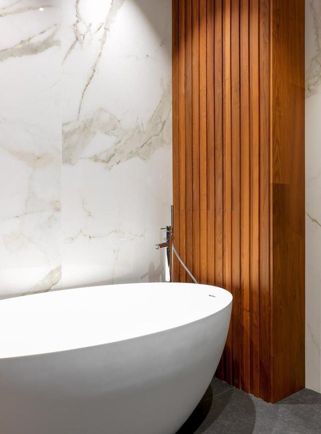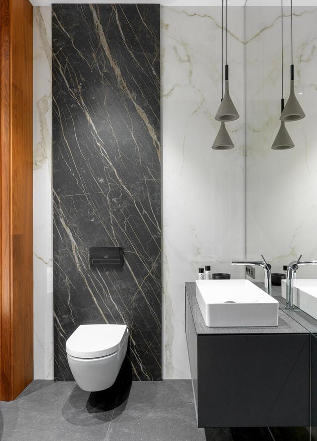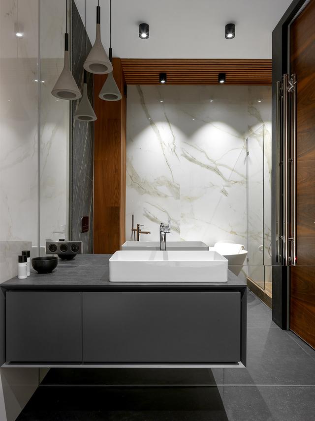 明亮的橘紅色木材與別致的黑色大理石面板和光滑的灰色梳妝臺相協調。