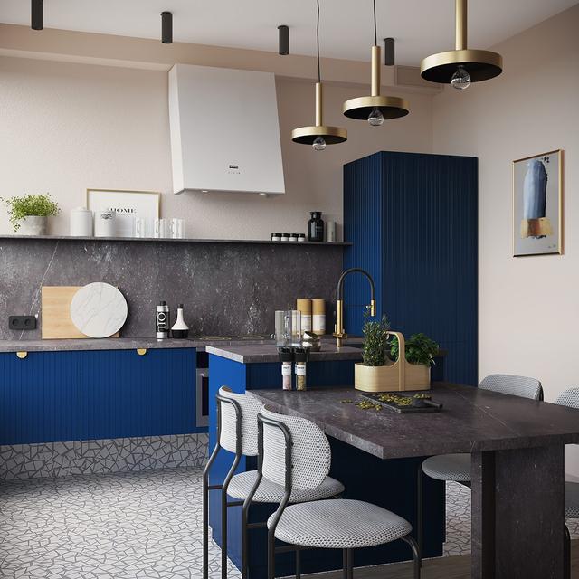 彩色馬賽克效果乙烯基地板包裹在廚房的護壁板上,與堅實的藍色基柜相得益彰。金色的把手和金色的水龍頭給廚房帶來了一種高端的外觀,并散發出與客廳橙色元素類似的視覺溫暖。