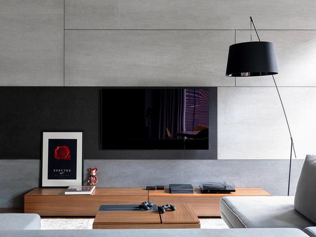 咖啡桌和配套的媒體單元在木紋中帶有橙色調。電視墻裝飾形成了一個酷的單色背景。