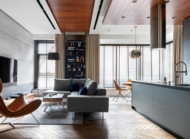 一個現代的沙發采用大膽的橙色,也是作為整個生活空間的中心色調。住宅總面積為72.7平方米,這使得客廳、廚房和餐廳形成了一個寬敞的開放式組合。一個單獨的藍色靠背墊使橙色的座位區更有復古的韻味。