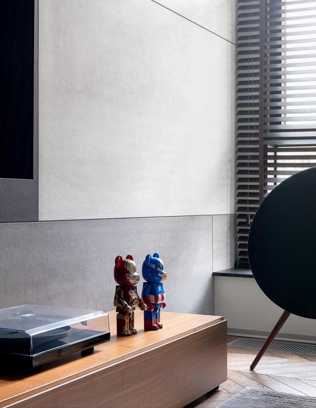 一對鍍鉻的臥室吊燈照亮了床頭柜,在那里可以看到更多超級英雄的裝飾。藍灰色的色調創造了一個更有戲劇性的氛圍。