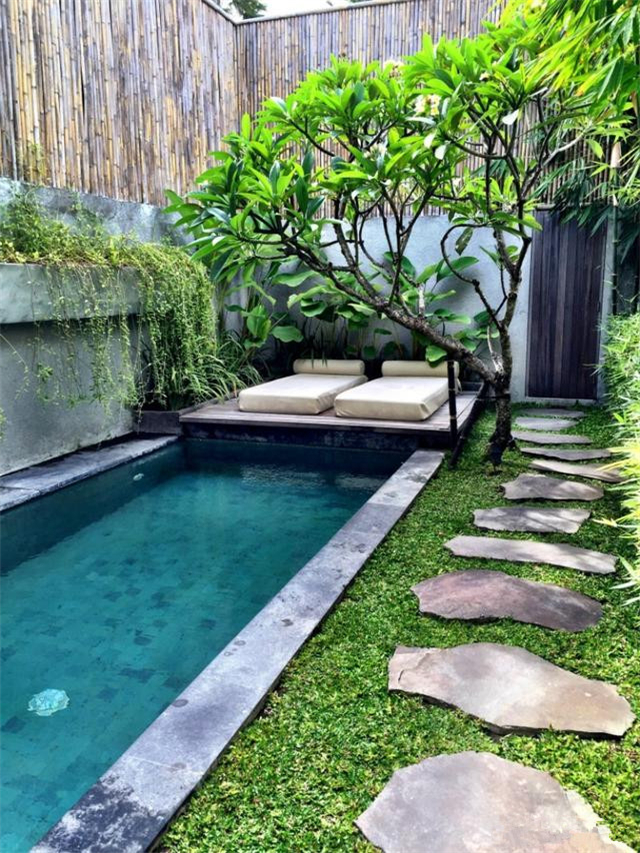 有沒有比巴厘島綠樹成蔭的別墅更好的例子呢?注意一個隱藏在綠色綠洲里的內置平臺,以及一個特殊的卷曲地面覆蓋物上不規則形狀的踏腳石。