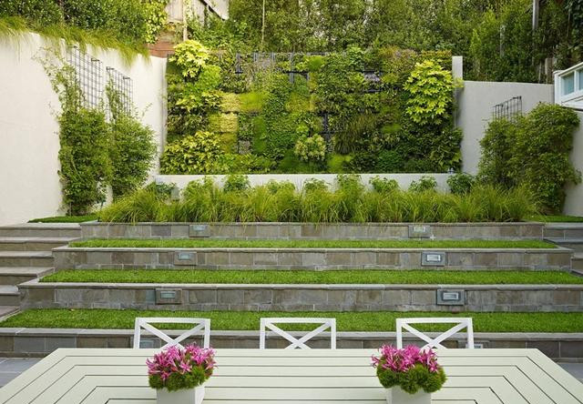 在這個后院里,設計師們用一堵綠色的墻往中間加上幾層草覆蓋的臺階。它為垂直花園創造了一個引人注目的視覺基礎。