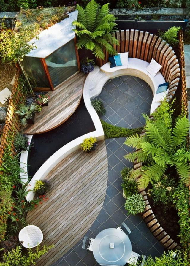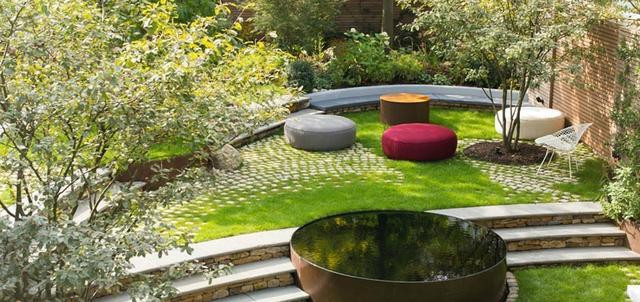 后院的布局不必是標準的和無聊的。看看這個驚人的設計,使用曲線和不同的材料,以分區出座位區和綠化。