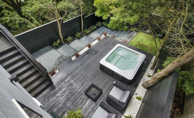 這一空間被劃分為一個木制的露臺和一個被植物包圍的內置熱水浴缸和一張餐桌。每一寸空地上都種著觀賞性的草和適度的花朵。