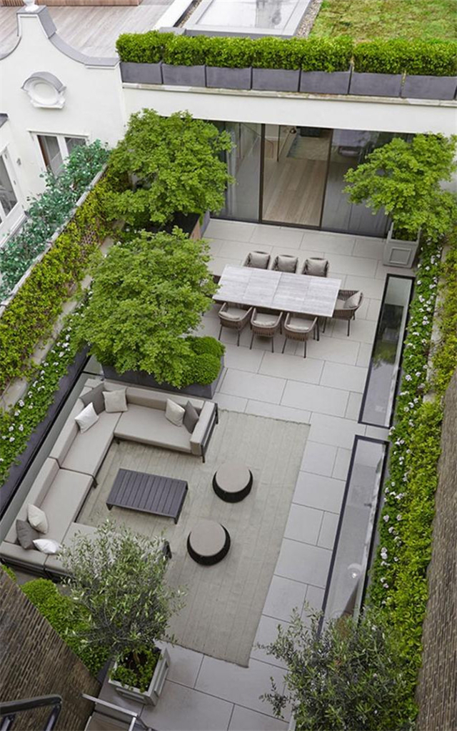 綠色植物看起來很適合任何風格。在這里,綠色的床和盆栽樹木勾勒出了后院的輪廓,給寒冷的單色設計注入了活力。