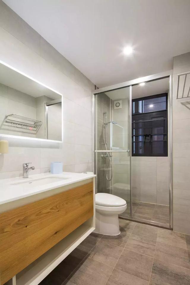 衛浴間也并非自成一體,顏色和質感,依舊與客廳保持同步。