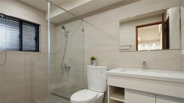 因為空間有限,衛生間則用透明的玻璃做分界線,這樣衛浴空間即不顯得太局促,又很好的解決了干濕分離問題。