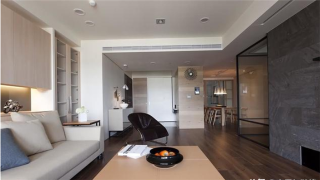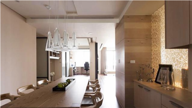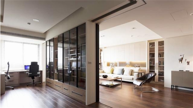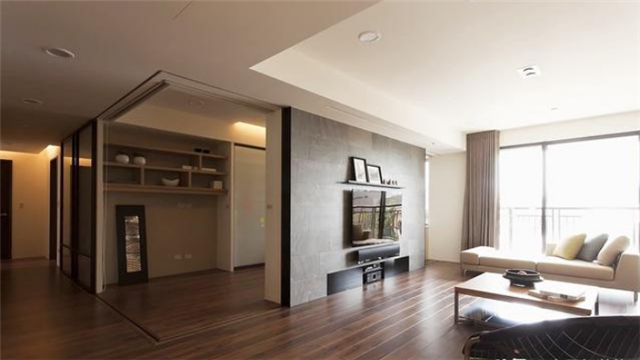 客廳電視墻則一體兩用,背向可作為書房書柜使用,旁側(cè)隱藏了軌道門,透過清玻璃的穿透特性,讓客廳與書房空間感彼此加乘,展現(xiàn)出更加放大的廳區(qū)范圍。
