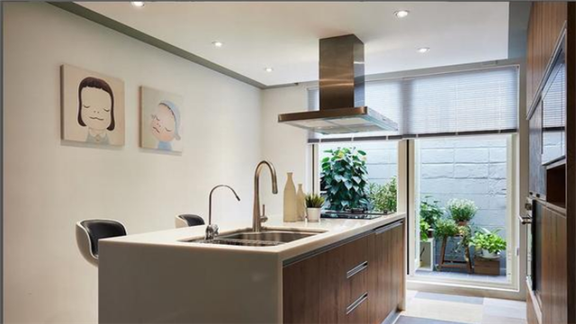 原來之配置唯一字形廚房,由于廚房寬度的問題,造成中間走道尺寸過于曖昧,大而無當,只能純為做為操作(服務)空間。在同樣的收納量的條件下,我們改采中島式廚房。讓原來走到過大的問題合理化,并提供使用者停留、交誼的空間。提供停留時間的重要性在于:一方面可供停留時間的設計在空間感上一定有其效果(通常操作空間是要被隔離起來的),所以對于強化客、餐廳的設計感有一定的效果,另一方面在使用上也更具有彈性:例如廚房也提供了用餐聚會功能,操作者與其他使用者同時間可以得到更多樂趣,而且強化附近空間的機能(例如可利用中島作為buffet的備餐臺,活化客餐廳的機能) 另外一提的是,廚房地磚是我們的累積下來的樣品,經過挑選后,我們提出不同地磚拼花的設計,免費!不但別具風格,也節省數萬元的預算。