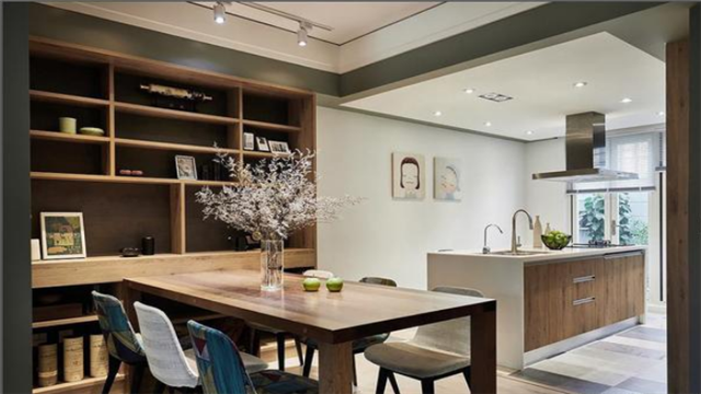 主要設計重點為:讓餐桌的功能性變得更強大,并因此提供停留于此空間的時間。因為餐桌連接廚房與客廳,廚房與客廳一但藉由設計成為視覺的焦點,那么廚房將是完整呈顯廚房與客廳設計感的位置。我們的作法是犧牲一側動線,讓餐桌變得更大,一方面強化其功能性,無論用餐、工作、聚會、看書等都可以使用此空間。而餐廳量感變大之后,與客廳廚房的連結性更強,也更好布置餐廳空間。另一方面,我們讓餐桌緊靠多功能餐柜,結合書柜、早餐吧臺、收納柜等等功能,強化餐廳的功能性,并支援客廳與廚房的使用,如此一來,無論在視覺上或功能上,所有公共、交誼空間都得以藉由餐廳而連結。