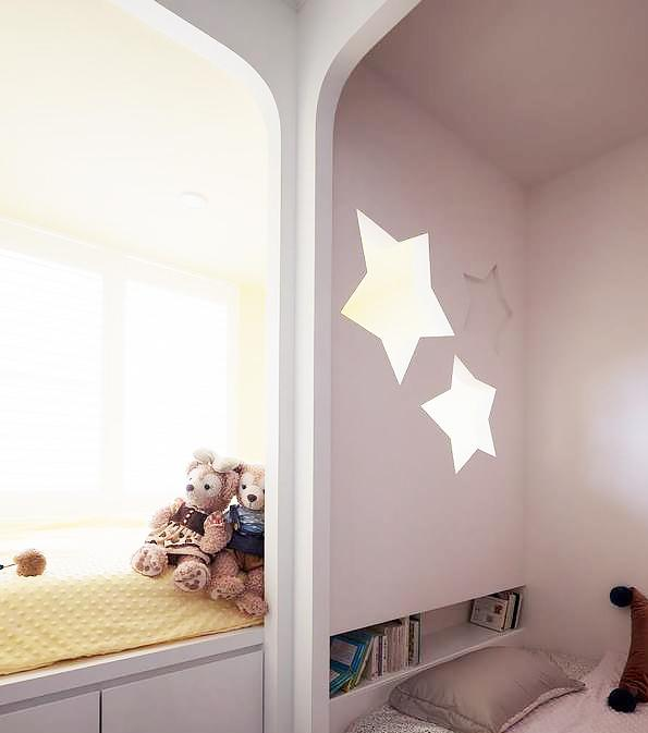 墻面鏤空設(shè)計除了增加陽光穿透度外,夢幻童趣的星星造型亦可增加上下鋪的對話樂趣,小朋友玩得不亦樂乎!