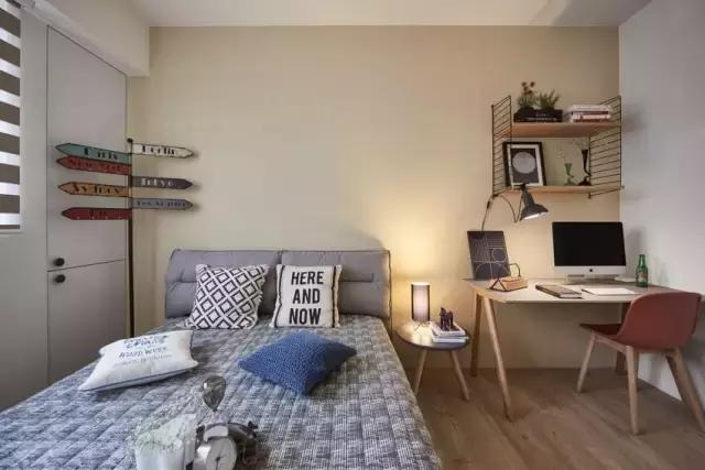 床頭背景墻設計了半高的原木,帶入田園寧靜的氣息。