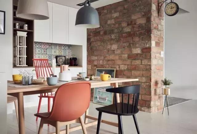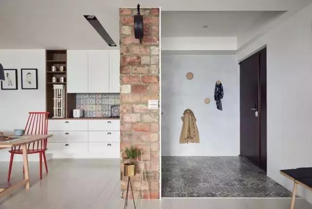 餐廳紅磚墻面將餐廳與玄關隔離開來。