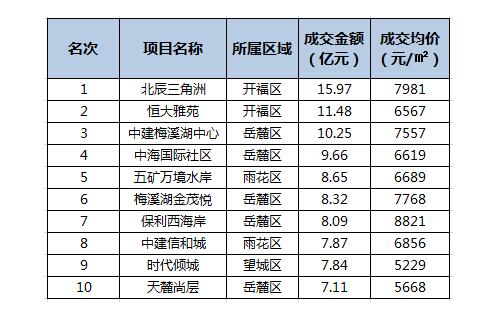 銷(xiāo)售額與成交均價(jià)走勢(shì)基本成正比,2015年12月銷(xiāo)售額94.37億元達(dá)到峰值。長(zhǎng)沙銷(xiāo)售額前十名項(xiàng)目如下——