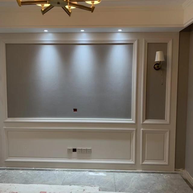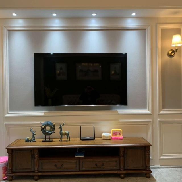 墻面上的造型是用石膏板外加石膏線條制作的,這種制作手法它的成本比較低,如果找一個手藝比較不錯的油工的話,做出來的活計是非常好看的。里面灰色的材質(zhì)是壁紙的效果,而且電視墻的造型兩邊還加了兩盞壁燈的效果。非常的漂亮大氣。