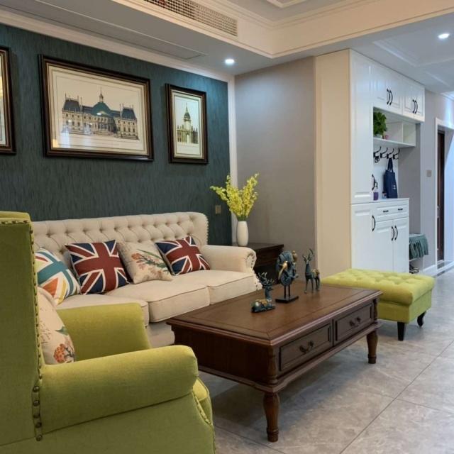 這是客廳的沙發(fā)背景墻,沙發(fā)背景墻后面貼的是深綠色帶花紋的壁紙,非常的不錯,這種一深一淺的顏色搭配起來效果非常的好看,很有層次感。