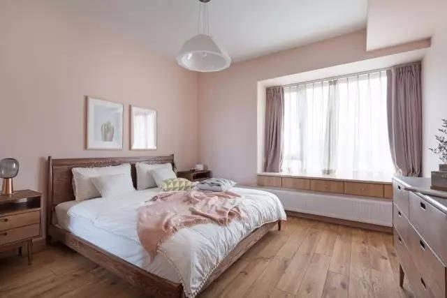 這是主臥室的設(shè)計,淡粉色的墻面充滿著的都是一股清新淡雅風(fēng),搭配上深木色的雙人床,非常的溫馨舒服。