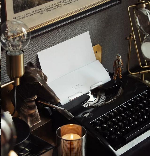 掛畫結合鐵藝腿深棕實木書桌,再加上Zoe老師特地買來的復古打字機和黃銅裝飾品,讓逼格上升了好幾個檔次,這樣工業復古的工作臺,又讓人感覺到了英國。