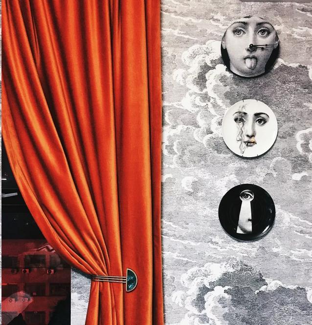 孟菲斯墻面的掛畫排列,烏云壁紙與掛畫顏色輕松呼應,橙色窗簾直接帶來視覺沖擊,讓人眼前一亮,同時也形成了強烈對比,祖母綠的窗簾扣也是非常巧用的點睛之筆。