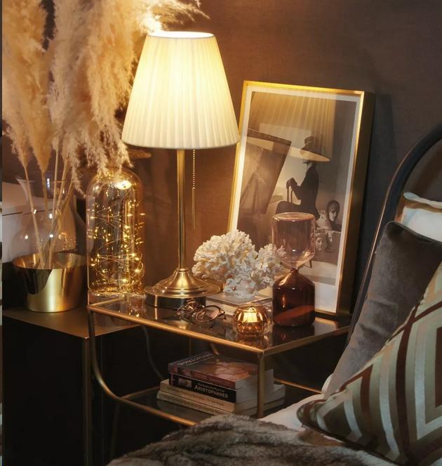 臥室采用了大量黃銅元素,高端大氣上檔次,床頭柜上的插畫與置物架上的書籍,文藝氣息撲面而來,色彩上也是兼具了摩登與溫暖。