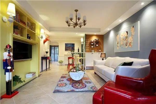 一張一字型的皮質白色沙發,背景墻采用淺藍色,掛上一副大寫的裝飾畫,很是和諧。電視背景墻采用明黃色搭配上大紅色單一和大紅窗簾,整個客廳多彩多樣,加上花色地毯,個性的茶幾,和一些大大小小的裝飾品,時尚味十足!