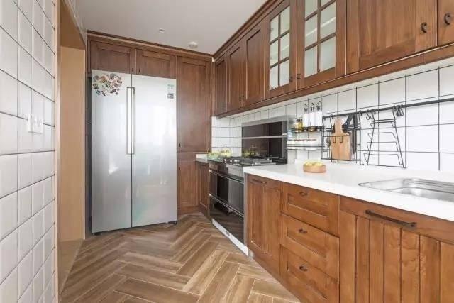 這是廚房的效果,廚房的櫥柜也是深木色的,不過墻面白色的瓷磚非常的亮眼,這種瓷磚也是比較流行的裝飾品之一,很適合在小面積的房間使用,比如說廚房、陽臺或者是衛生間,都是可以使用的。