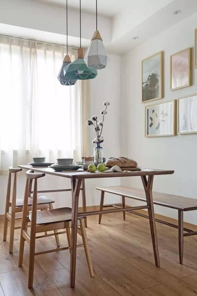 原木色的餐桌椅,樣式充滿了流行的元素,但是這種流行的元素一點都不夸張,反而覺得有種可愛風格的美,這種美感讓人坐在椅子上就不想起來的沖動。還有三盞北歐風格的小吊頂,造型個性,充滿現代流行的元素。