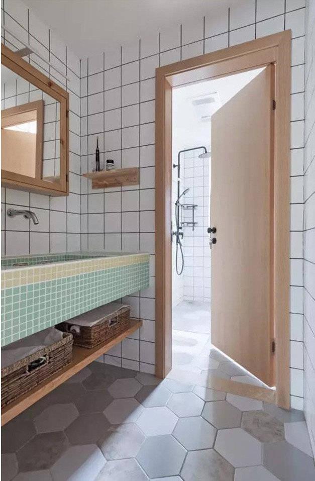 這是衛生間的效果,衛生間個人比較喜歡的就是地面上的這種六角磚,六角磚也是越來越流行的磚的品類之一,也很適合在過道,或者是小面積的區域使用,甚至也可以在墻面不規則使用,效果非常的好看。