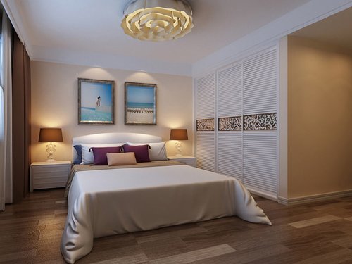 主臥地板鋪設(shè)安信復(fù)合木地板,與客廳的地板顏色互相配合,讓臥室采光更加充足。