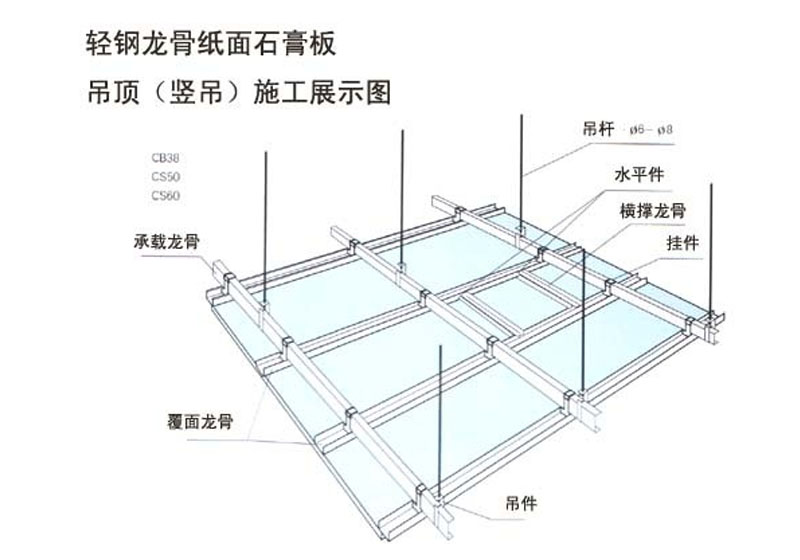 輕鋼龍骨吊頂施工工藝流程:彈標高水平線—畫龍骨分檔線—固定吊掛桿件—安裝主龍骨—安裝次龍骨—龍骨骨架全面校正—安裝罩面板—安裝壓條。