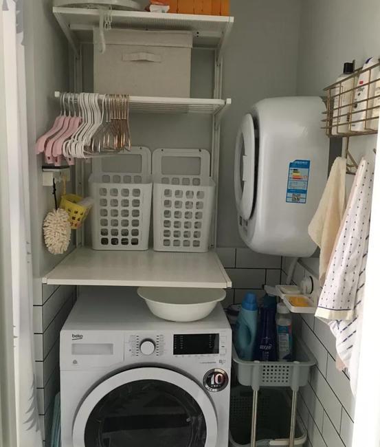 先來看里面的洗衣區,擺放了一個滾筒洗衣機,雖然洗衣機占地面積比較大,但是上方的空間也是利用起來了,放了一個組裝的置物架,用來放一些平時要用到的臟衣簍和衣架。右側狹縫中還放置了一個落地置物架,簡直將空間利用到了極致。