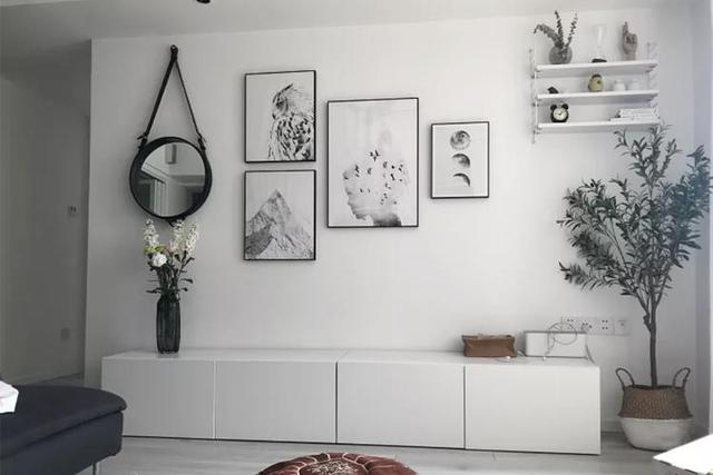 她家客廳沒有安裝電視,只在電視背景墻處做了一排電視柜儲物,然后在墻面掛上裝飾畫,再搭配上幾個綠植,呈現出清新唯美的畫面。