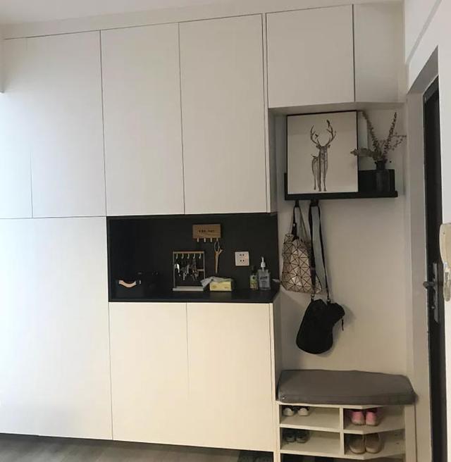 入戶后的靠墻處安裝了一排到頂的柜子,讓空間得到充分的利用。中間還特意采用留空設計,用來掛一些衣服、鑰匙、包包等出門攜帶的物品。下面的分格凹槽可以放常換的鞋子,讓空間得到合理的利用。